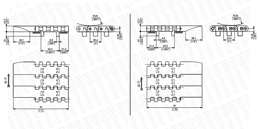 1"節(jié)距重載鏈板 USPG ATM系列與USP模塊化網(wǎng)帶結(jié)合使用。動態(tài)過渡模塊 USPG ATM在不使用固定板的情況下,產(chǎn)品可在兩段90°輸送段間進行過渡。特殊飛翼形狀的模塊,在網(wǎng)帶攜帶產(chǎn)品進行動態(tài)過渡時,提供產(chǎn)品支撐;有左,右兩種形式。