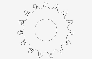 齒數(shù)就是齒輪有多少個齒的意思,Z表示齒數(shù)。如圖為15齒的齒輪。