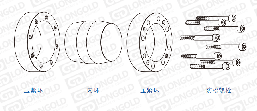 兩個(gè)帶內(nèi)錐?的壓緊環(huán)在壓緊螺釘?shù)淖?下,擠壓帶有外錐面的內(nèi)環(huán),使其收縮壓緊輪轂和軸,產(chǎn)?的徑向壓?和摩擦?將輪轂和軸聯(lián)結(jié)在?起。