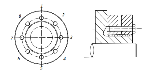 2.將壓緊螺釘擰?相應(yīng)的螺紋孔內(nèi),按圖所示多次逐步擰緊,直到達(dá)到螺J規(guī)定的擰緊?矩。