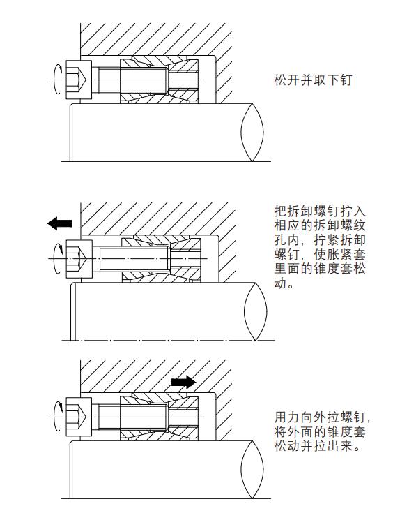 拆卸脹緊聯(lián)結(jié)套時,先將全部螺釘松開并取下,然后將拆卸螺釘擰入相應(yīng)的拆卸螺紋孔內(nèi)(裝有鍍黃鋅螺釘?shù)穆菁y孔),