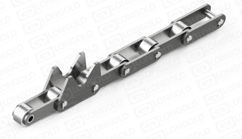 此種輸送鏈?zhǔn)怯呻p節(jié)距鏈條衍生而來(lái)的,鏈條節(jié)距為非常用規(guī)格,通過(guò)裝備特殊附件使鏈條滿足特定的工作需求
