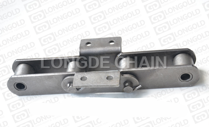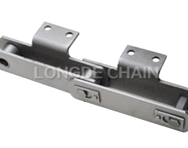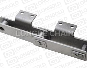 此種輸送鏈?zhǔn)怯呻p節(jié)距鏈條衍生而來(lái)的,鏈條節(jié)距為非常用規(guī)格,通過(guò)裝備附件使鏈條滿足特定的工作需求.