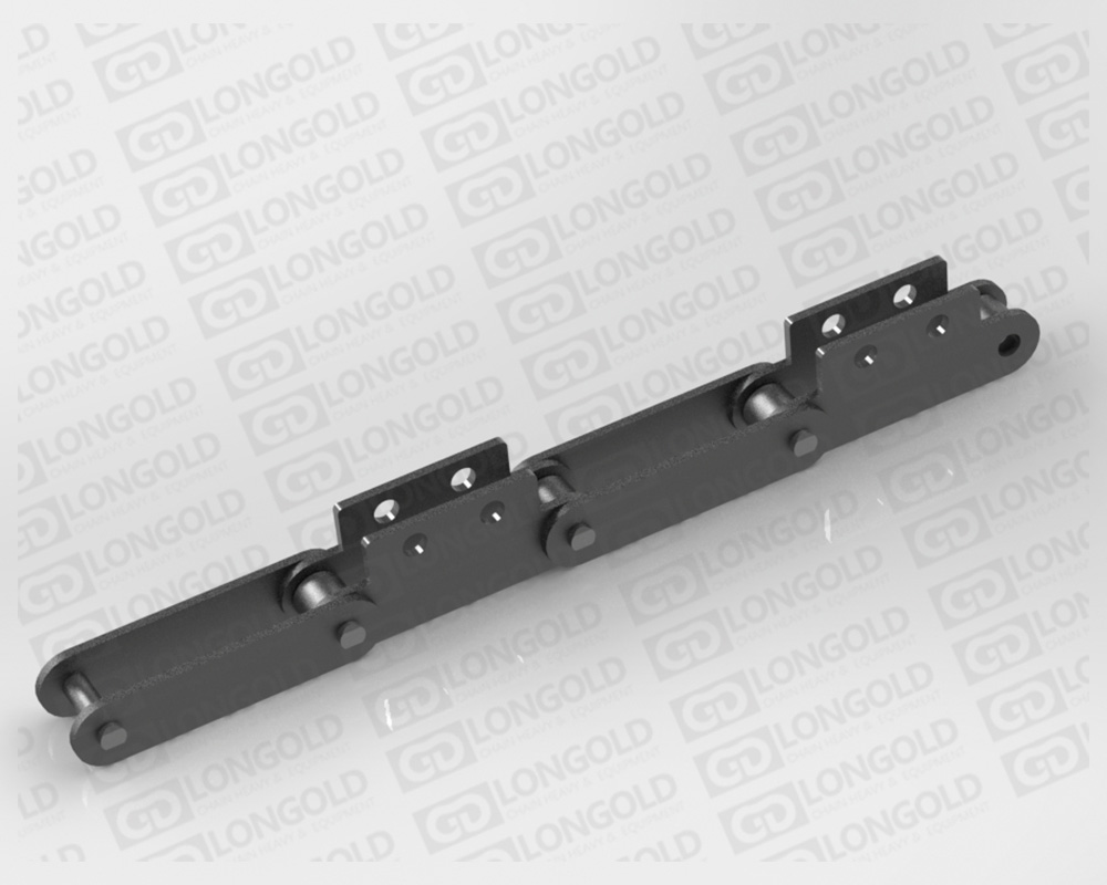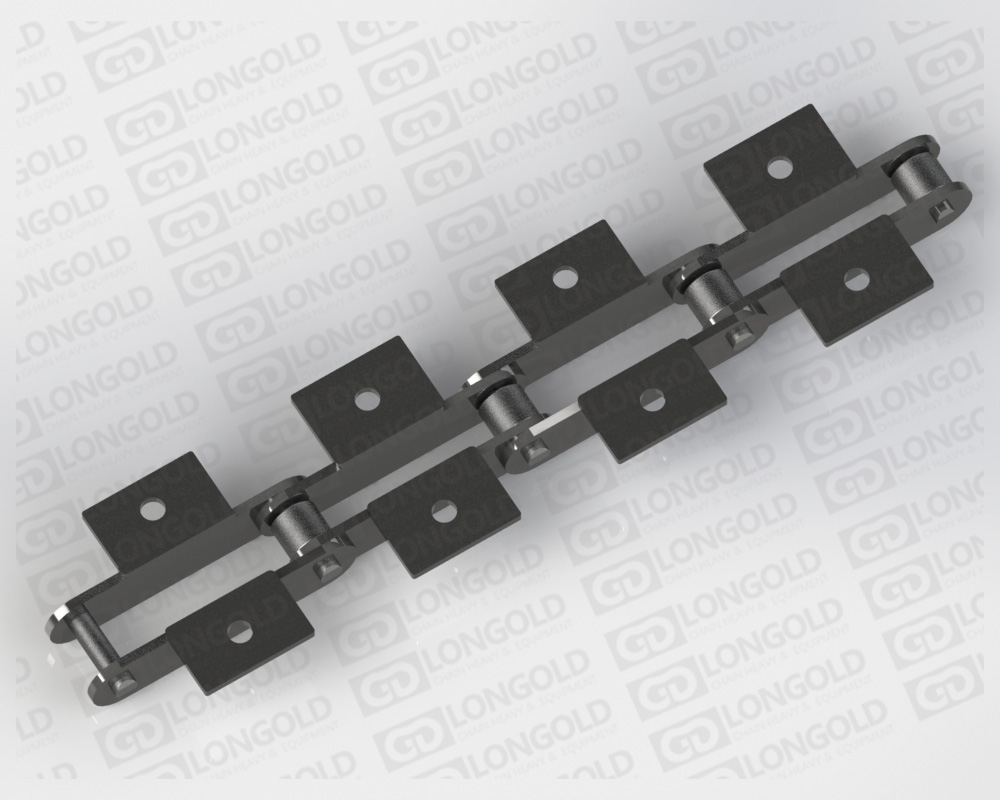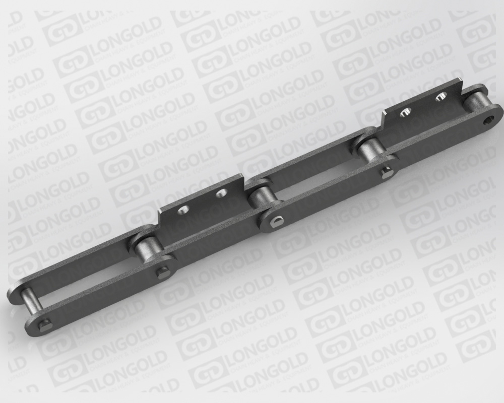 在大型輸送鏈條的單側(cè)加裝折彎板附件的鏈條。附件是為了將夾具安裝在鏈條上的零部件,可根據(jù)客戶要求設(shè)定安裝間隔。附件上帶有1個(gè)或者2個(gè)或者3個(gè)孔,附件表示為:A1、A2、A3。