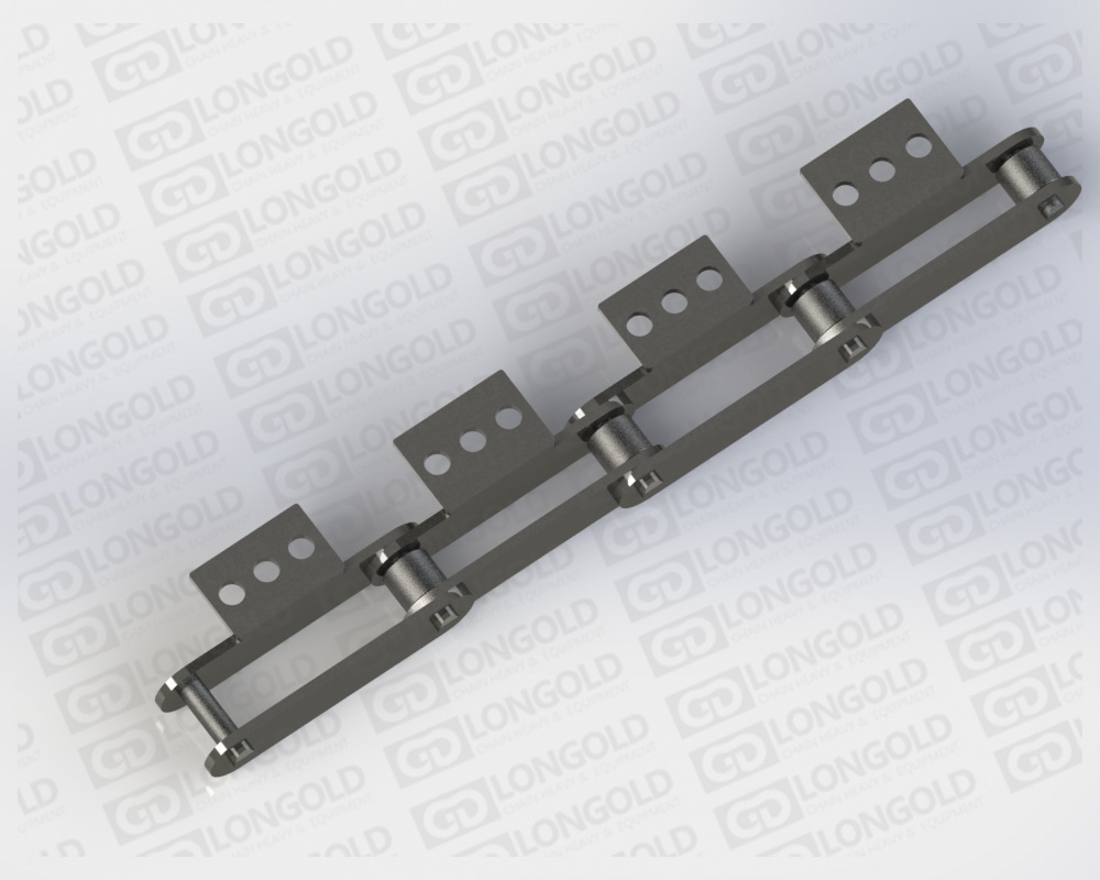 在10100·10125·10150米制節(jié)距大型輸送鏈條的單側(cè)帶直立翼板附件的鏈條。附件上帶有2個螺孔,附件表示為:SA2。附件是為了將夾具安裝在鏈條上的零部件,每個鏈節(jié)都帶1個SA2附件。