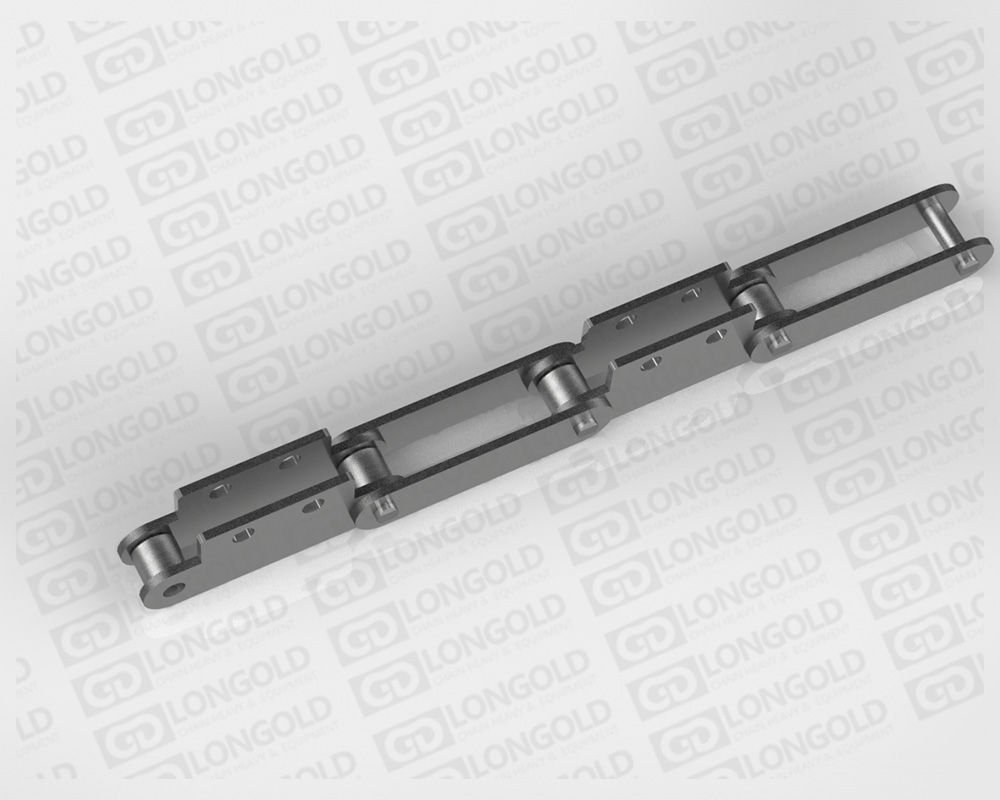 在10100~10150米制節(jié)距大型輸送鏈條的單側(cè)特殊形狀和開(kāi)孔的鏈條。附件是為了將夾具安裝在鏈條上的零部件,可根據(jù)客戶要求設(shè)定安裝間隔。單側(cè)鏈板上帶有螺孔,附件表示為:GA2、GA4。
