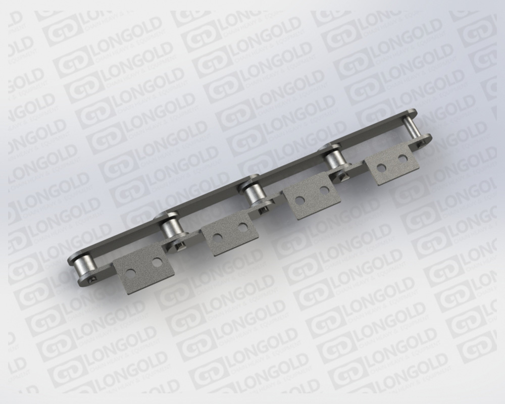 在10100·10125·101500米制節(jié)距大型輸送鏈條的兩側(cè)帶直立翼板附件的鏈條。附件上帶有2個(gè)螺孔,附件表示為:SK2。附件是為了將夾具安裝在鏈條上的零部件,每個(gè)鏈節(jié)帶1個(gè)附件。