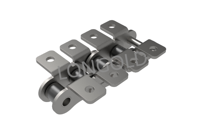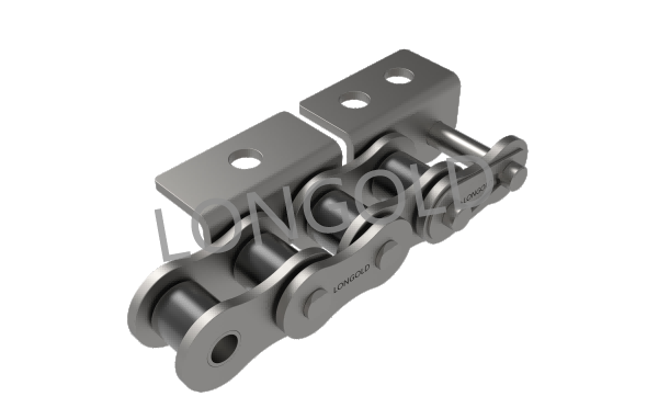 短節(jié)距標(biāo)準(zhǔn)滾子鏈(傳動(dòng)用)型的鏈板上安裝了附件的鏈條。適用于短距離(通常10m以下)輸送,通常使用小節(jié)距鏈條輸送小型零部件。也適用于低噪音等環(huán)境。