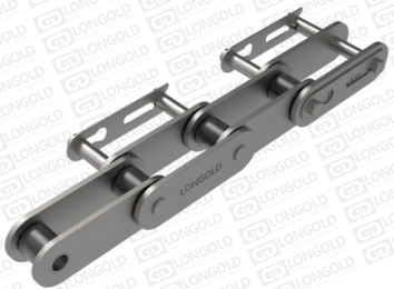 帶卡簧延長銷雙倍節(jié)距鏈條,鏈條的一側(cè)銷軸延長的,且延長銷軸的末端帶有卡簧槽,利用卡簧安裝夾具等。附件表示為:EC。