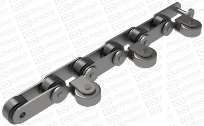 帶導(dǎo)向滑輪雙倍節(jié)距輸送鏈將導(dǎo)向滑輪作為蛇形防止與常規(guī)滾子使用。與帶附件A系列滾子鏈相比,鏈條節(jié)距成倍數(shù)(稱為雙倍節(jié)距),鏈板形狀為直板形。?附件表示為:GR。
