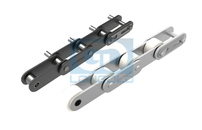 本體鏈條為雙倍節(jié)距輸送鏈,鏈條滾子為工程塑料制R滾子。本體鏈條可為普通規(guī)格,鍍鎳規(guī)格和SS不銹鋼規(guī)格。