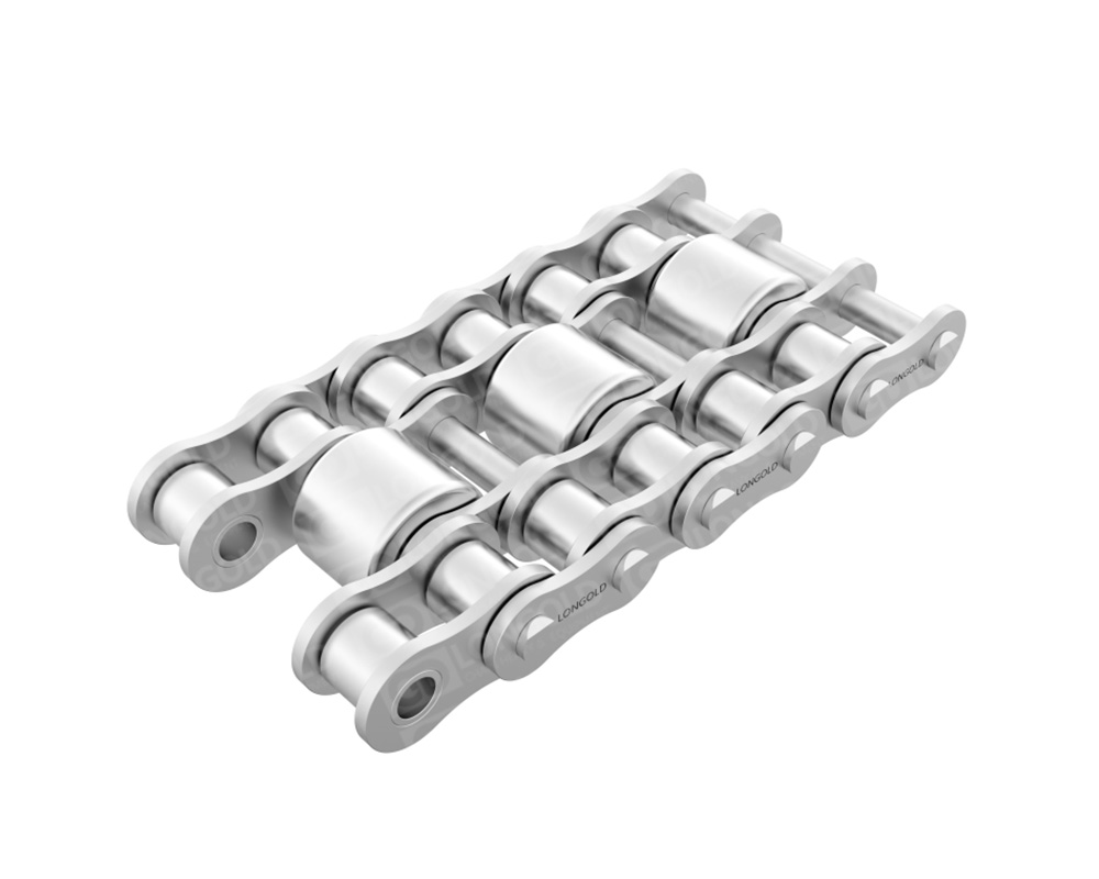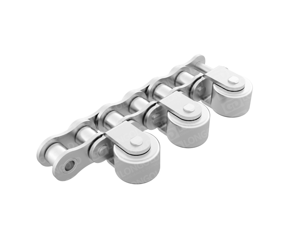與頂置滾子鏈相比,不銹鋼中心滾子鏈重心較低,兩側(cè)滾子同時受力,因此可實現(xiàn)穩(wěn)定輸送。采用兩側(cè)標準滾子鏈,中間每隔兩節(jié)裝配一個大滾輪結(jié)構(gòu),用于輕型物料的輸送