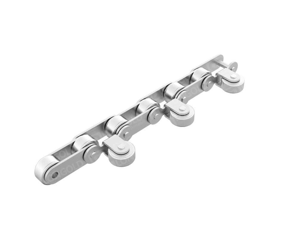 本體鏈條為雙倍節(jié)距滾子鏈條,單側(cè)帶具有導(dǎo)向作用的滾輪。鏈條本體和鏈條本體的滾子都為不銹鋼制,具有耐腐蝕性