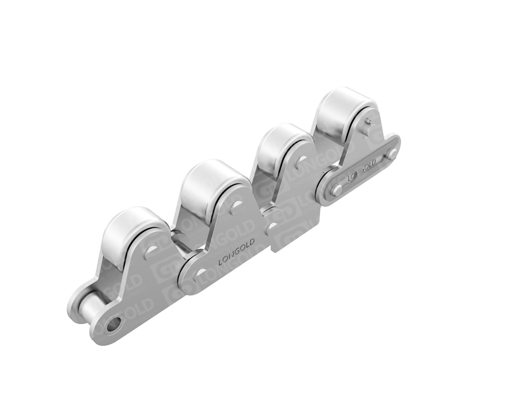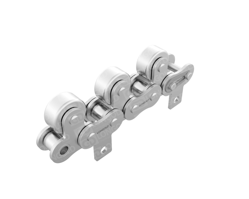 帶頂置滾輪輸送鏈設(shè)計用于在輸送系統(tǒng)中提供平穩(wěn)的物料搬運,頂置滾輪有助于減少摩擦,特別是在需要鏈條在特定角度或方向上移動的應(yīng)用中。