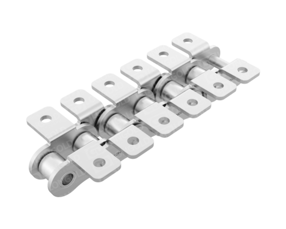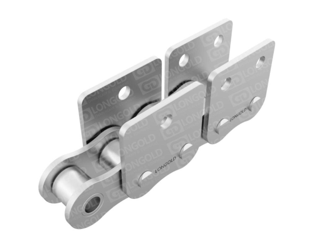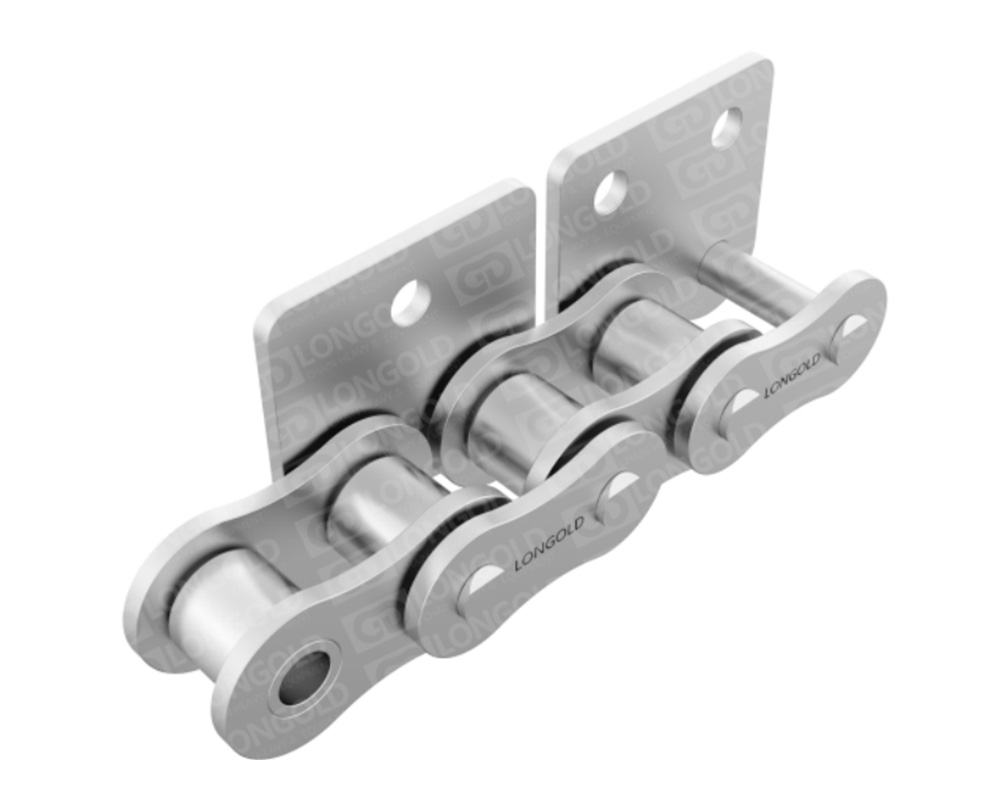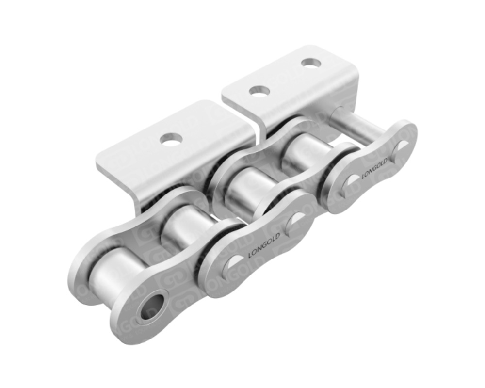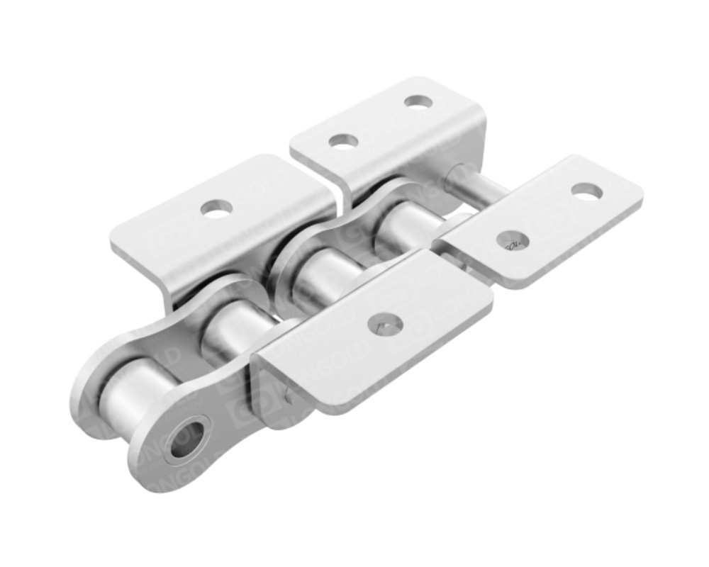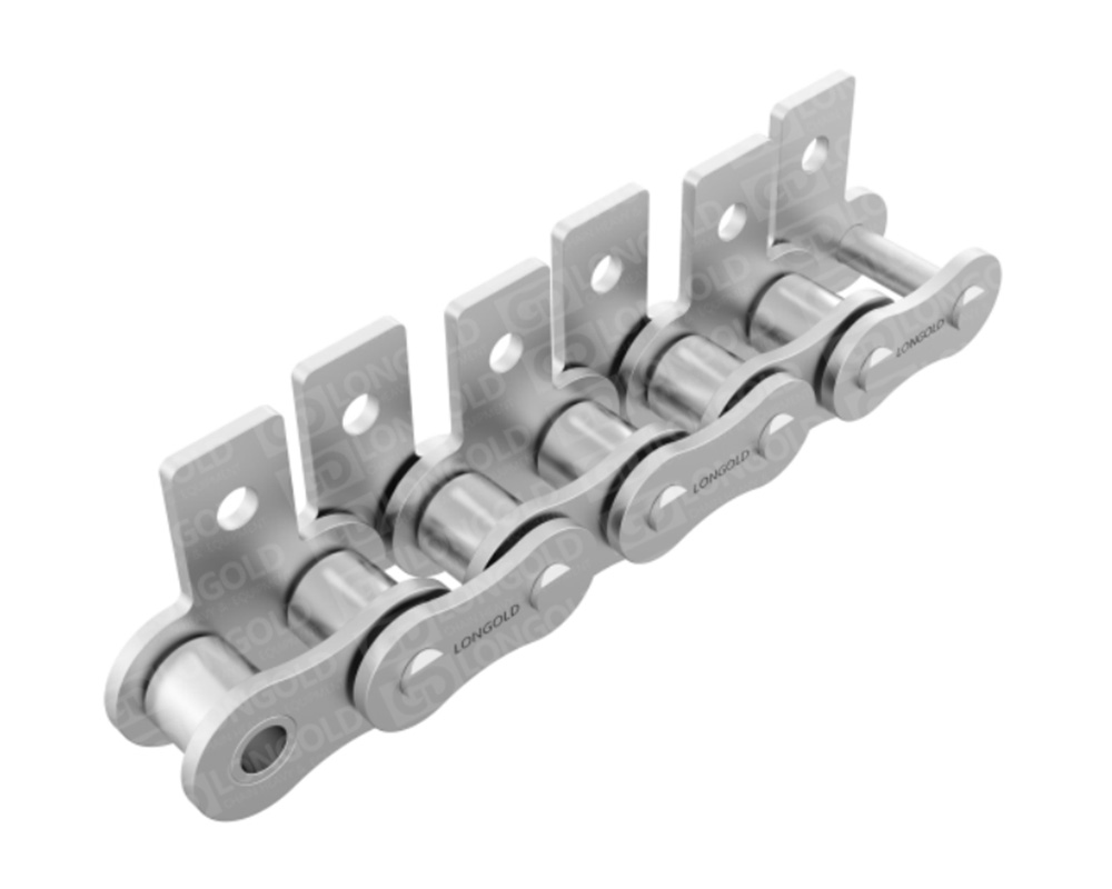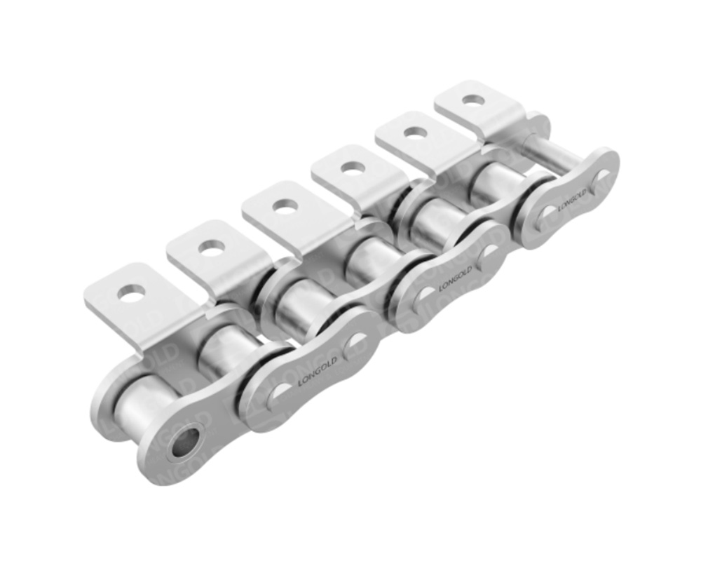 采用SUS304材質(zhì)的標(biāo)準(zhǔn)型的帶附件A系列滾子鏈。適合于水中、酸性、堿性或高溫低溫(-20℃~400℃)等特殊環(huán)境下的使用。鏈條單側(cè)帶折彎板附件,附板上帶有1個螺孔,附件表示為:A1。