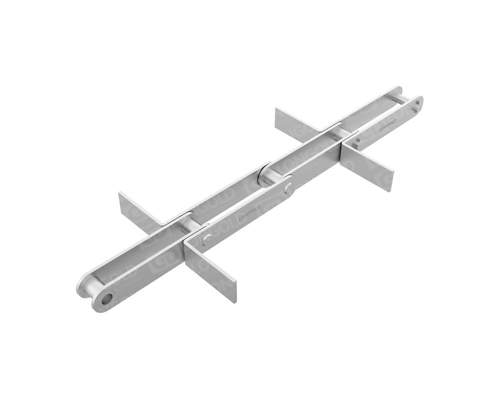 不銹鋼刮板輸送鏈由只起牽引作用的基本鏈節(jié)與完成刮送作業(yè)的帶刮板的鏈節(jié)組成。刮板輸送鏈結(jié)構(gòu)簡(jiǎn)單,只要依次將一個(gè)鏈節(jié)的尾桿插入相鄰鏈節(jié)的叉頭,推入銷軸組成鉸鏈