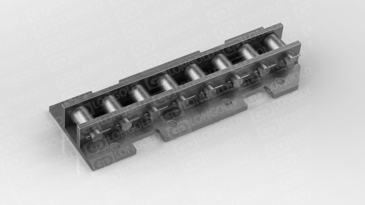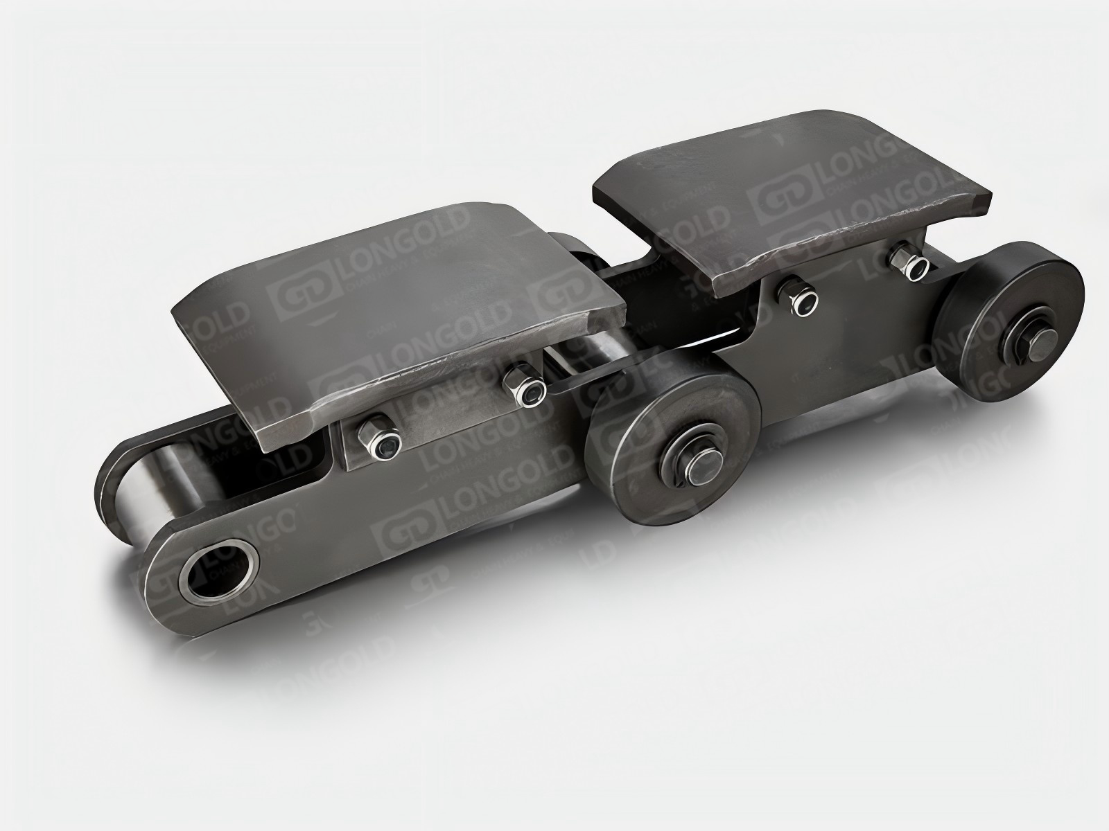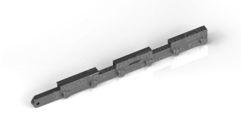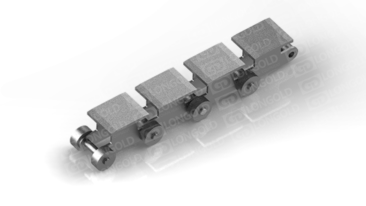 鏈條的頂板中間平,兩側則下彎,與相鄰頂板形成固定槽,這種結構既可以用來輸送矩形鋼材,又能輸送柱狀鋼材,此外,鏈條兩側帶側置滾輪,可使鏈條的載重能力提升。