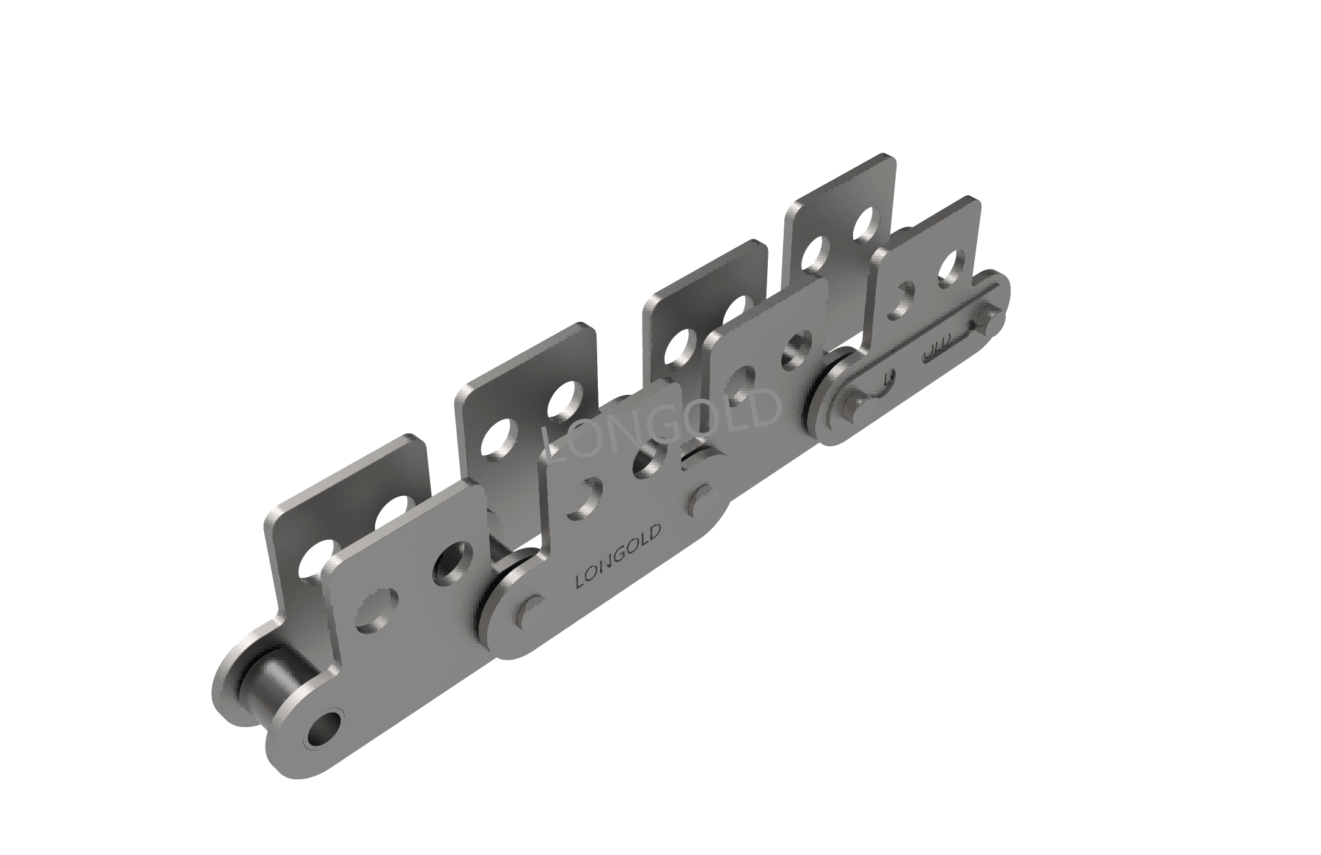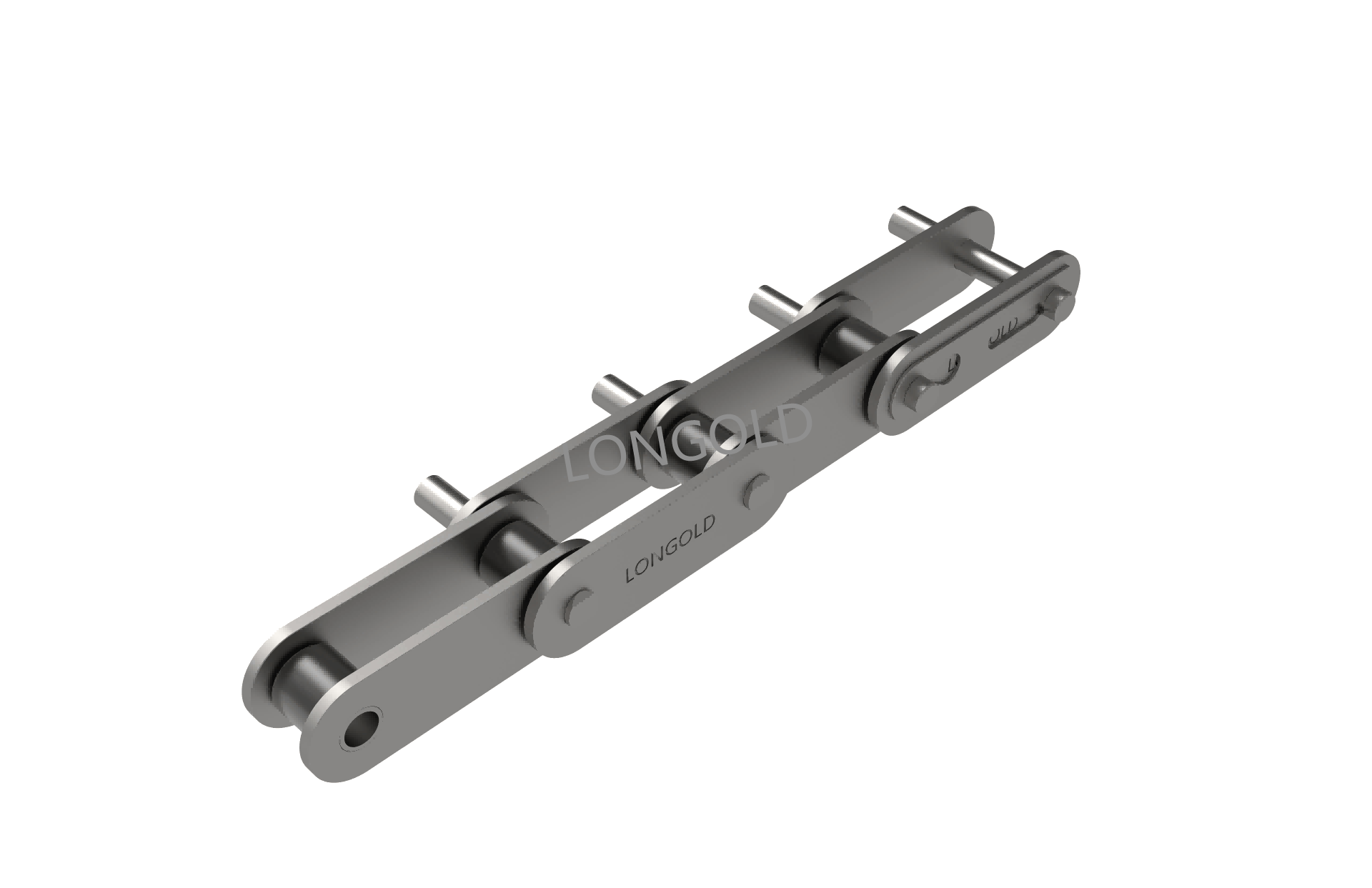 ANSI標準滾子鏈條的節(jié)距增加一倍,其他尺寸不變的鏈條。鏈條執(zhí)行ISO標準,鏈條單側(cè)鏈板向上下兩側(cè)延伸,且延伸的附板上帶有1個孔。