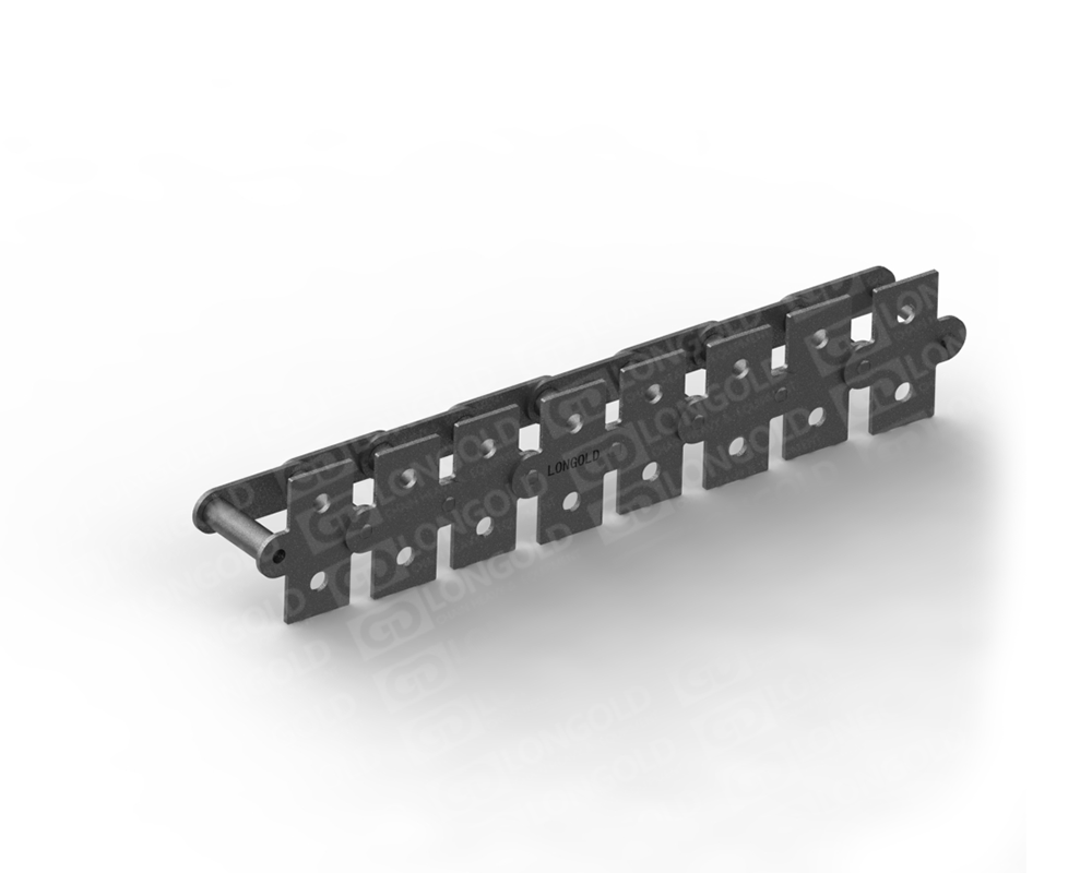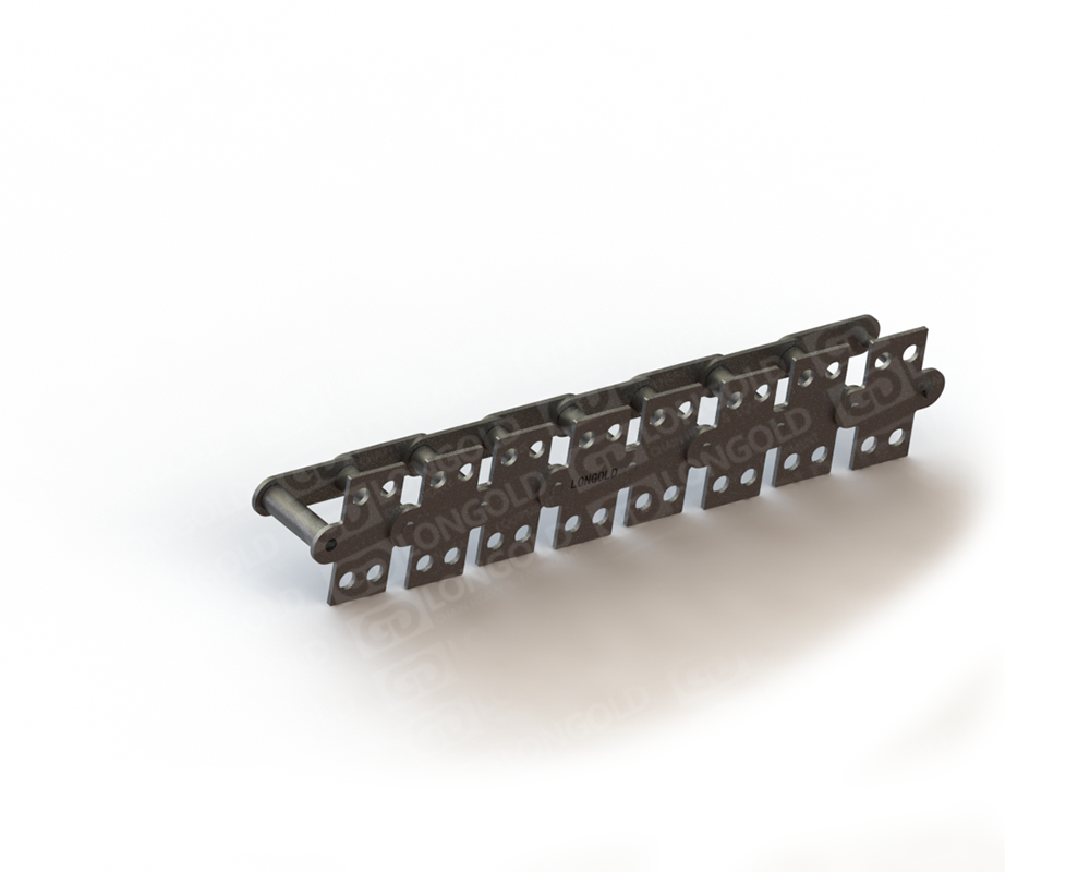 ANSI標準滾子鏈條的節(jié)距增加一倍,其他尺寸不變的鏈條。鏈條執(zhí)行ISO標準,鏈條單側(cè)鏈板向上下兩側(cè)延伸,且延伸的附板上帶有兩個孔。