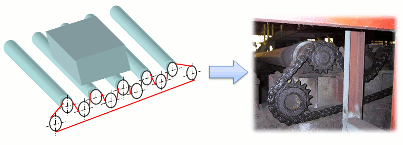 在鋼鐵設(shè)備,軋鋼滾筒輸送機(jī)的各滾筒的多軸驅(qū)動(dòng)用途