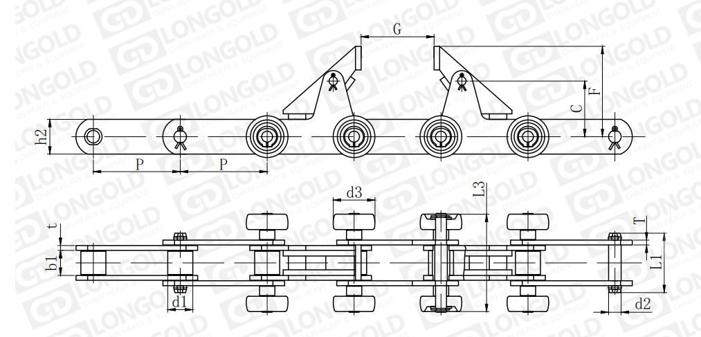 鏈條雙側(cè)帶側(cè)置滾輪,同時鏈條帶傾斜推頭附件。