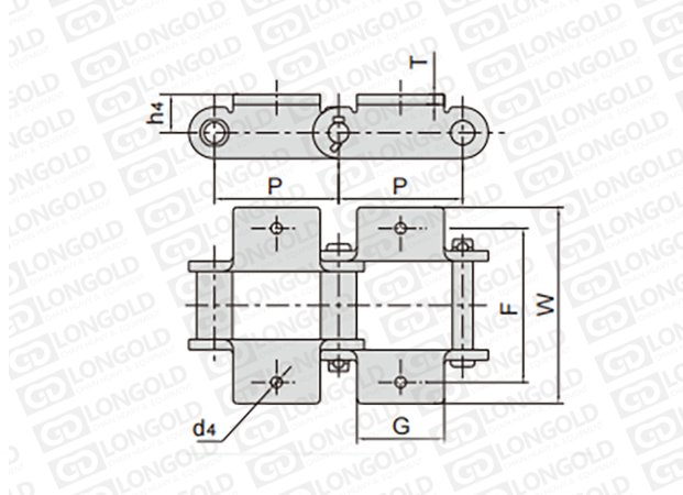 鏈條為套筒鏈,且?guī)1附件,即鏈條兩側(cè)鏈板帶折彎板,折彎板上帶一個孔。