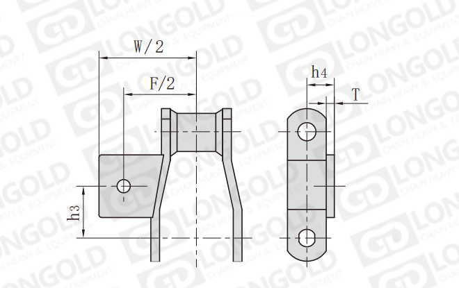A1型附件:這些附件是帶有安裝孔的附板,平行于鏈節(jié)節(jié)距中心線安裝在鏈節(jié)的一側(cè)鏈板彎部上。