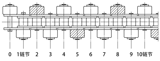 圖是按對稱形每兩個鏈節(jié)帶一個側(cè)置滾輪的例子。 對稱形每兩個鏈節(jié)帶側(cè)置滾輪時,安裝塑料制動滾輪,以每六個鏈節(jié)(圖例中畫斜線的側(cè)置滾子對應的鏈節(jié))為標準。