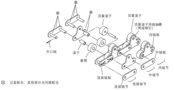 4. 按偶數(shù)鏈節(jié)附帶頂置滾子時(shí),若未指定,均將頂置滾子安裝在外鏈節(jié)上。