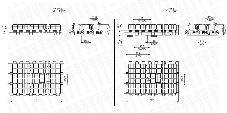 上圖為1"節(jié)距重載網帶與鏈板 LBP USPM系列系列,圖紙中已標明部分尺寸。