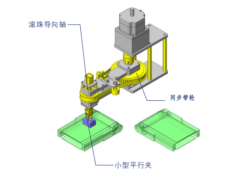 ?的:通過同步帶輪和同步帶的傳動動力,將傳送帶上的工件旋轉(zhuǎn)90°并轉(zhuǎn)移到下一道工序。此時,夾緊機構(gòu)進行180°自轉(zhuǎn),轉(zhuǎn)移時不相對于輸送方向同時改變工件方向。